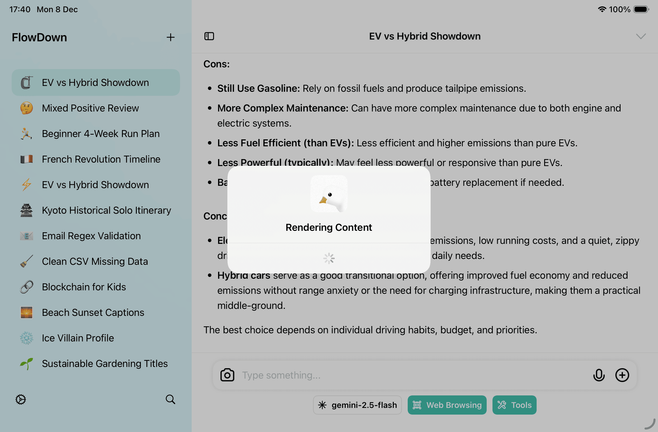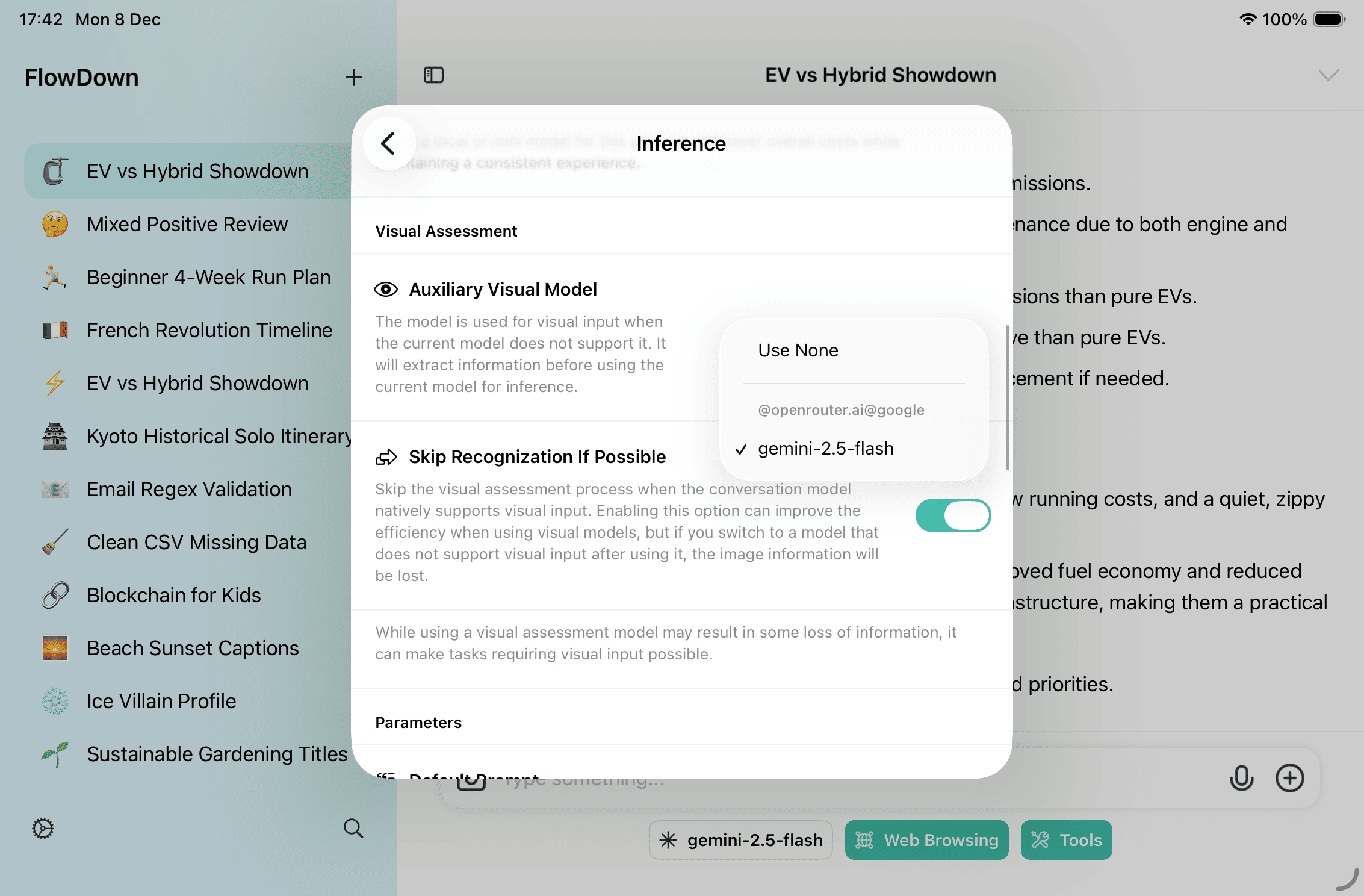 - Text-only models: FlowDown calls the Auxiliary Visual Model to turn images into text before sending.